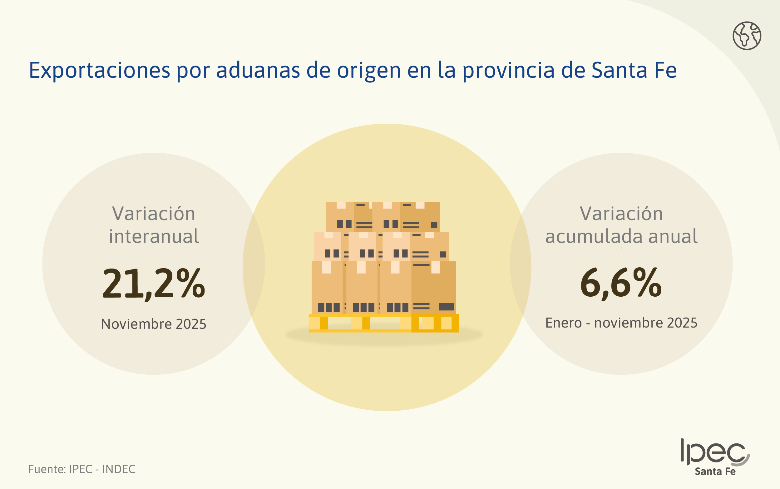 El informe de Exportaciones por aduanas de origen y aduanas de salida de la provincia de Santa Fe muestra de forma mensual la evolución de las exportaciones registradas en las aduanas de la provincia de Santa Fe. Los datos se presentan por aduanas, según rubros y países de destino.